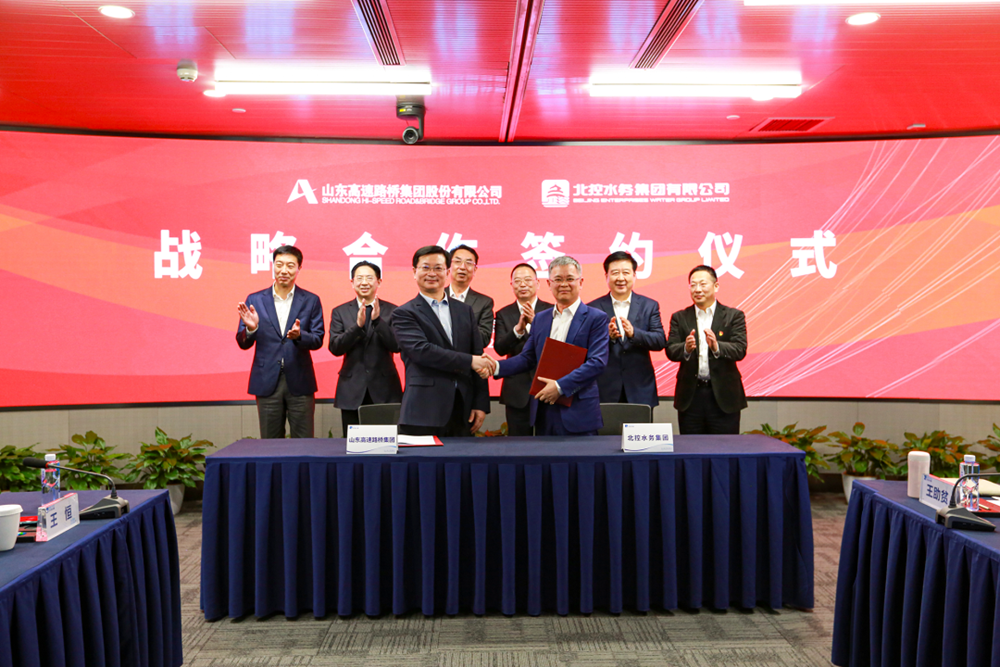 3月21日,公司與北控水務(wù)集團(tuán)在京簽署戰(zhàn)略合作框架協(xié)議,雙方將本著“資源共享、優(yōu)勢互補(bǔ)、強(qiáng)強(qiáng)聯(lián)合、互惠互利”的原則,構(gòu)建合作共贏、可持續(xù)發(fā)展的戰(zhàn)略合作伙伴關(guān)系。山東高速集團(tuán)總工程師、公司黨委書記、董事長周新波與北控水務(wù)集團(tuán)總裁周敏分別代表雙方簽約。山東高速集團(tuán)黨委書記、董事長周勇,黨委常委、副總經(jīng)理李航,執(zhí)行總監(jiān)、山高金融集團(tuán)董事會(huì)主席王小東;北京控股集團(tuán)黨委書記、董事長田振清,黨委常委、副董事長、常務(wù)副總經(jīng)理、北控水務(wù)集團(tuán)董事局主席李永成,黨委常委、副總經(jīng)理王劍,總經(jīng)理助理、北京控股總裁熊斌等及北控水務(wù)集團(tuán)執(zhí)行總裁李力等執(zhí)行機(jī)構(gòu)領(lǐng)導(dǎo)出席簽約儀式。